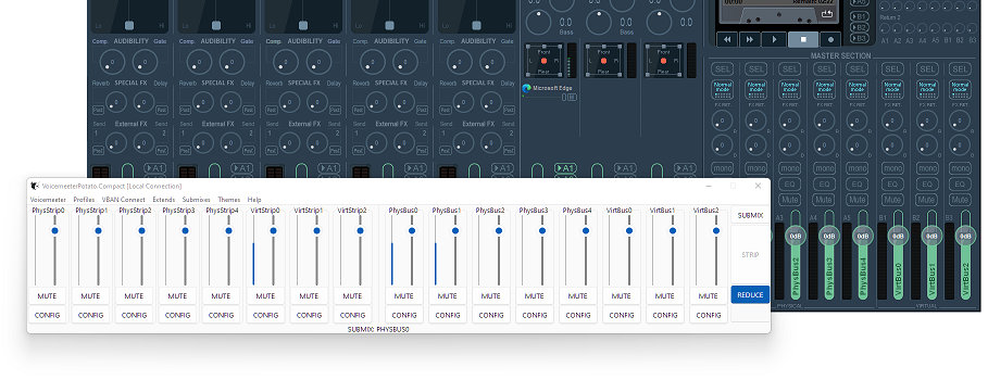 Once you're happy with the configurations, you can then save or load configs for future use. A single menu item "Voicemeeter" can be opened using Alt and then V.